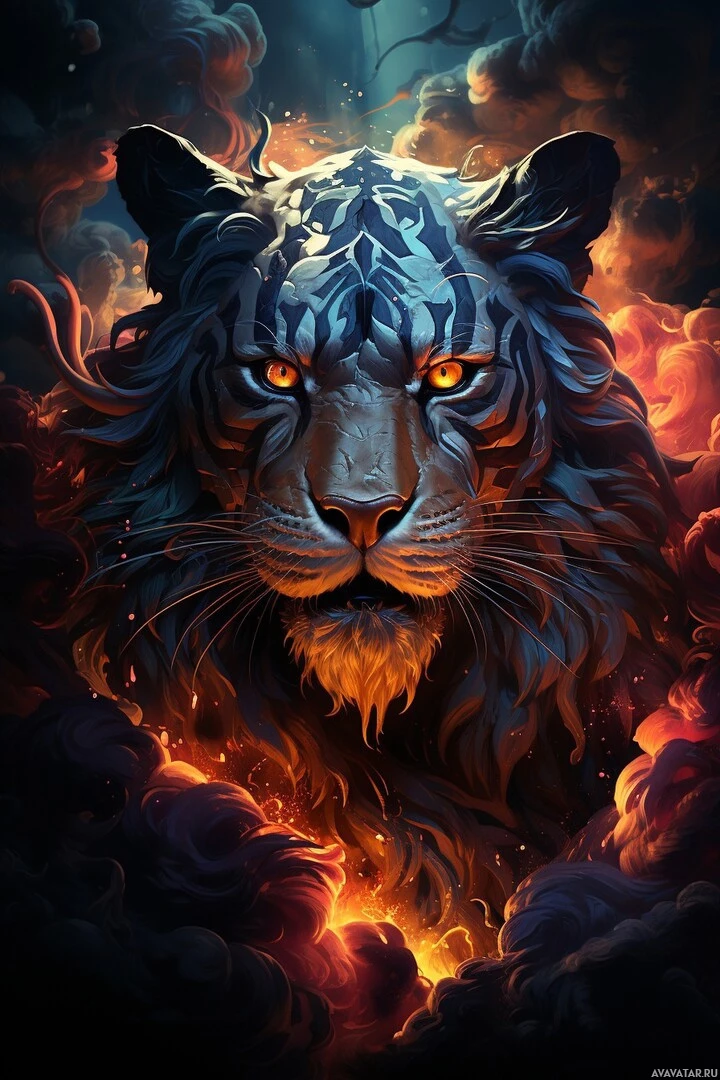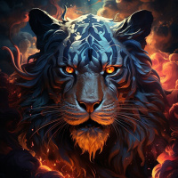 a majestic figure set against what appears to be flames or a fiery background. The lighting highlights the tiger's powerful facial features, such as its eyes, nose, and whiskers, which are rendered in