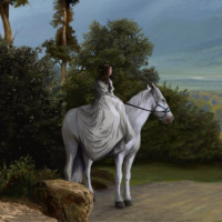 a scenic landscape with mountains and forests in the background. The style of the artwork suggests it could be from