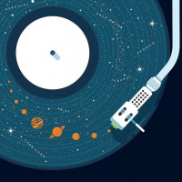 a vinyl record with a space-themed design on the label. A stylus is placed on the record, suggesting it's being played or about to be played. The backdrop features an illustration of
