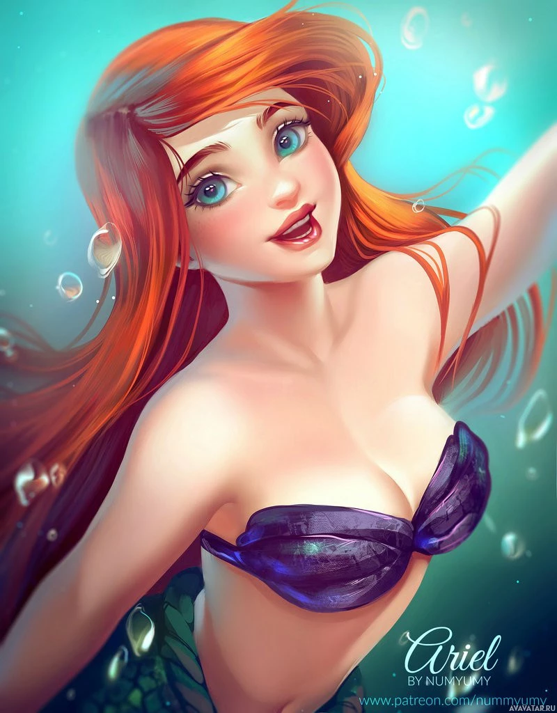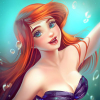 red hair and wearing her iconic purple and blue tail. Ariel appears to be smiling and seems to be in motion, possibly swimming or dancing underwater, surrounded by bubbles. The artist has signed the image with "Ariel" in the lower right corner.