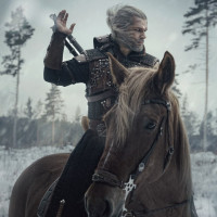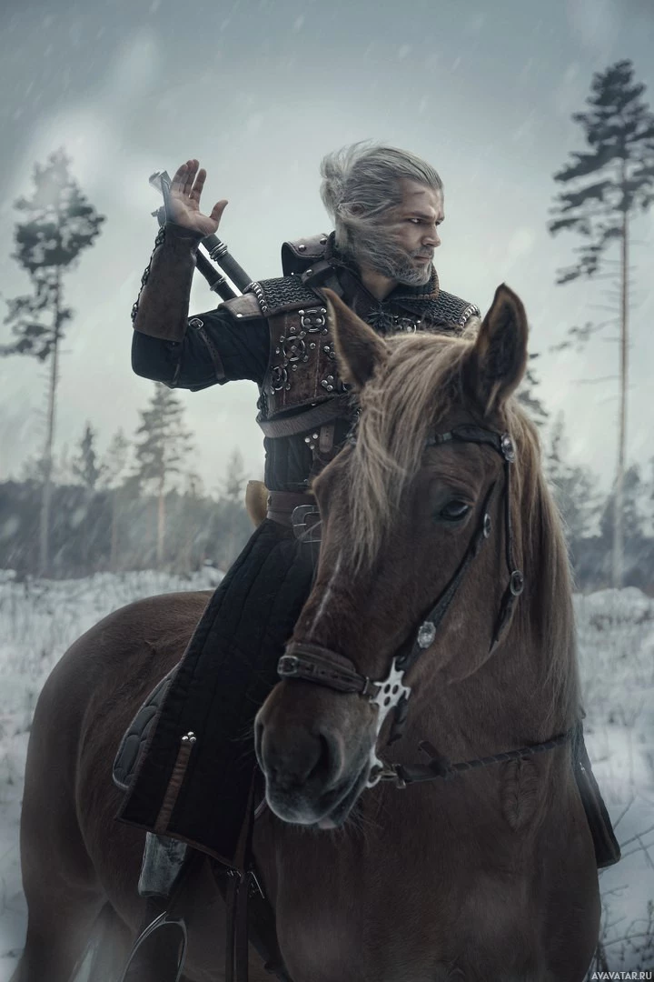 monster hunter and witcher, equipped with armor and weapons suitable for combat against supernatural beings. In this particular scene, he appears to be riding a horse through a snowy forest, which suggests that the image could be from a promotional material or