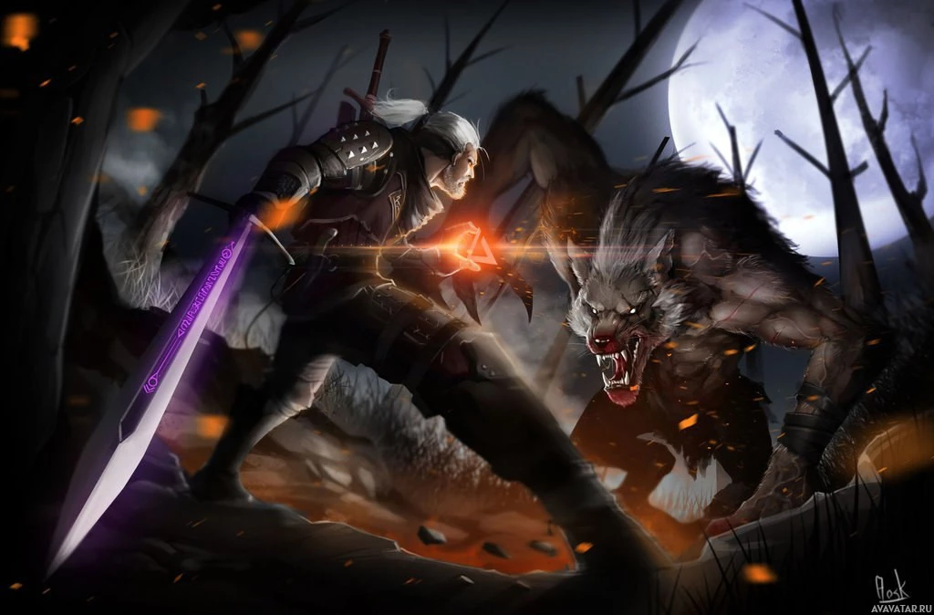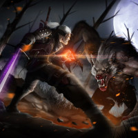 a full moon, which suggests it might be a moment from the game where Geralt is facing a dangerous creature.