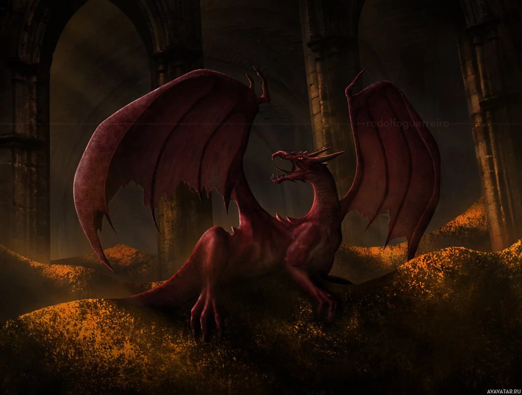 a fierce expression on its face and is set against the backdrop of what seems to be a dark, gothic-style architecture with stone archways and columns. The ground beneath the dragon is covered in what looks like