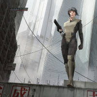 a video game, movie, or similar media. It features a character standing on what looks like a rooftop of a futuristic city with high-rise buildings in the background, possibly depicting a cyberpunk or dystopian