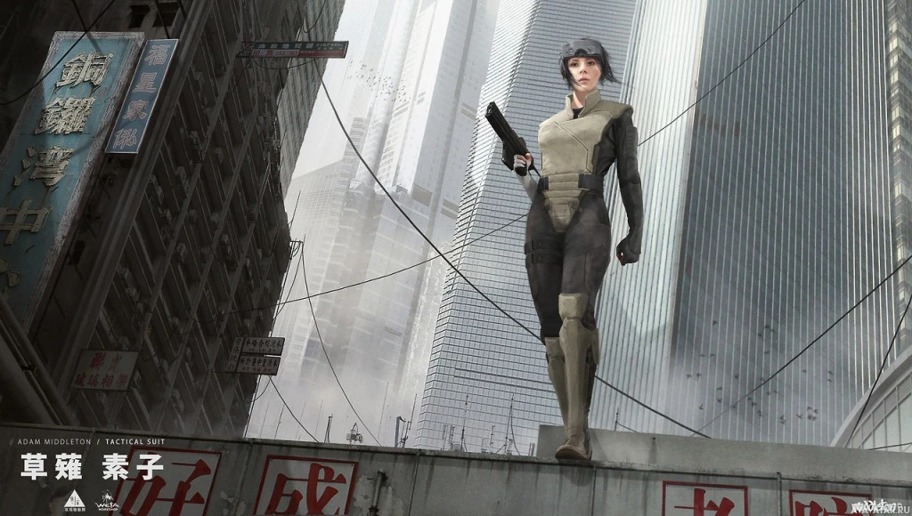 armored suit with a helmet and seems to be holding some sort of weapon, suggesting she might be involved in combat or espionage activities. There are also red text banners on the buildings behind her, but due to the resolution, it's difficult to read their content clearly. The overall impression is that of a high-tech, action-oriented narrative set in a dense