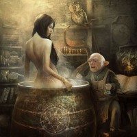 the old man, and she seems to be intrigued by his work. The woman has dark hair and is dressed in a medieval-style costume with a corset and skirt, which adds to the fantasy or historical theme of the image. The setting looks like an alchemist's laboratory or kitchen from a different era, with various items such as books, bottles, and potions scattered around. The overall atmosphere is one of mystery and magical realism, typical of certain genres in fantasy literature and film.