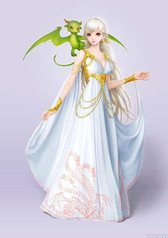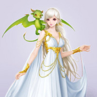 a small dragon perched there, adding to the fantastical theme of the image. The character exudes a sense of elegance and is situated against