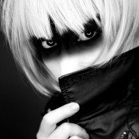 white hair and dark makeup around the eyes. They are wearing