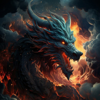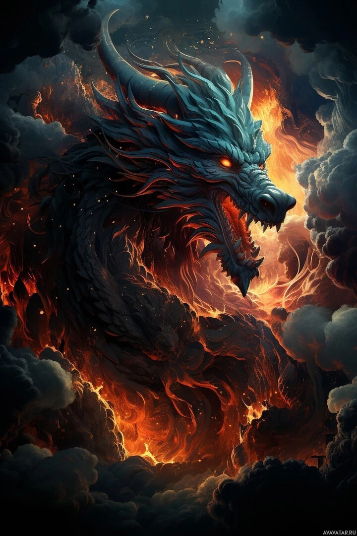 design with horns and scales, and it appears to be emerging from or being surrounded by flames. The background suggests an apocalyptic or intense atmosphere, possibly indicating the power or destruction associated with such a creature in this context. This image is likely intended for use in fantasy-themed media, such as books, games, or other artwork.