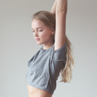 На картинке изображена женщина в серой рубашке и розовом нижнем белье. Она держит руки на голове, что может указывать на то, что она тренируется или растягивается. Ее волосы светловолосые, и она смотрит прямо в камеру с нейтральным выражением лица.