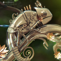mechanical components and wiring that give it the appearance of a robotic construct rather than a natural animal. The background consists of greenery, including leaves and flowers, which are likely intended to contrast with the metallic and man-made elements of the chameleon. The overall theme seems to be