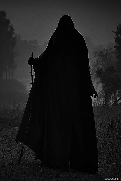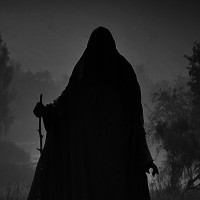 an elongated silhouette. They are holding a staff or stick in their right hand and are looking to the left side of the frame with a thoughtful or contemplative expression. The setting appears to be outdoors at night or