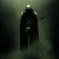 a fantasy setting. The individual is dressed in robes with a hood obscuring their face and carries a staff topped with a crucifix. They are holding up a hand in what could be a gesture of blessing or teaching. A sword lies next to them, which may suggest they also serve a role as a protector or warrior within their community. The background is dimly lit with
