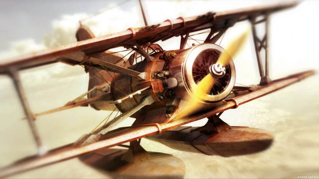 The image shows an old-fashioned propeller aircraft, which appears to be a biplane. The plane is characterized by its two