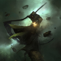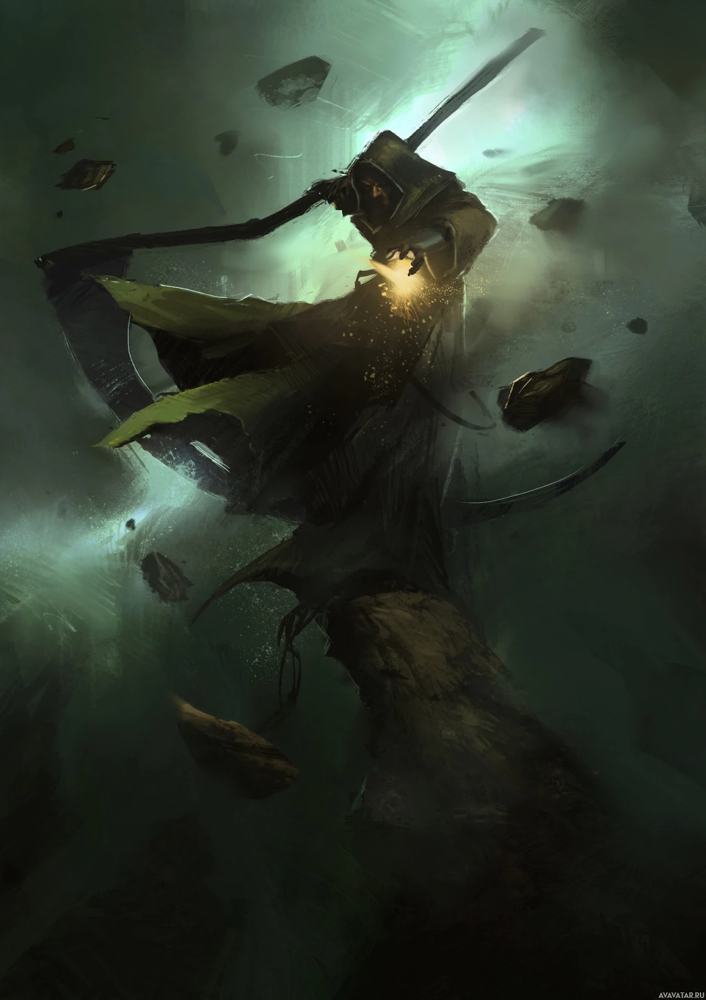 a magical battle or spellcasting. The figure is hooded, suggesting they could be a mage, and is surrounded by a swirl of dark, ominous clouds that might indicate
