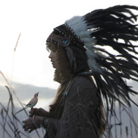a feathered headdress and garments that appear to be inspired by indigenous clothing. They are holding a bird in their hand, possibly a pigeon or another small
