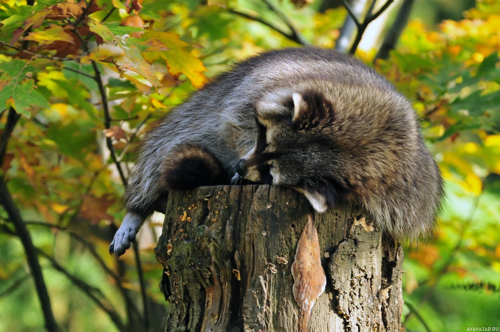 front paws hanging over the side of the stump. Its eyes are closed, suggesting that it might be sleeping or simply relaxed in this position. There is no text visible in the image.