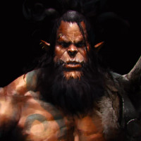The image shows a character that appears to be an orc from a fantasy setting. The character has a muscular build, with a prominent beard and mustache, and is wearing what seems to be armor or a protective garment. The character's expression and pose suggest they could be a warrior or fighter in the context of the fantasy world this artwork represents.