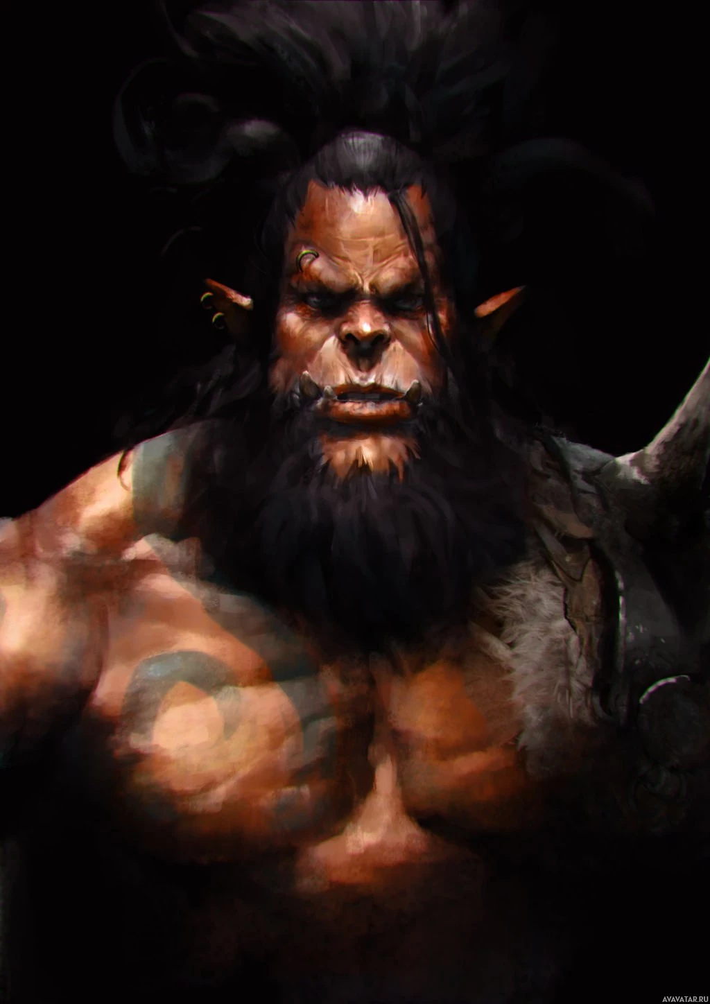 Картинка показывает персонажа, который кажется орком из фэнтезийной обстановки. Персонаж имеет мускулистое телосложение, с заметной бородой и усами, и носит то, что кажется доспехом или защитной одеждой. Выражение и поза персонажа предполагают, что он может быть воином или бойцом в контексте мира фантазий, который представляет это произведение искусства.