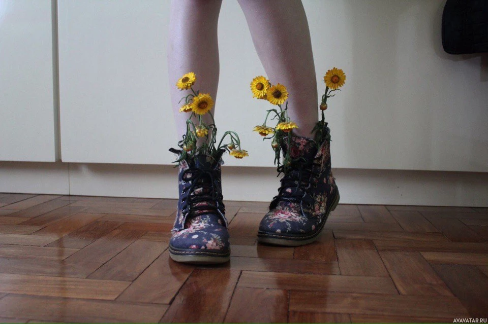 На картинке изображен человек, носящий сапоги с цветочными рисунками на них, а цветы растут из подошв сапог. Это создает художественный и причудливый эффект, так как необычно видеть растения, прорастающие непосредственно из обуви.