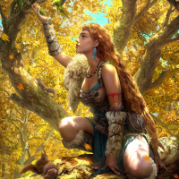 fantasy setting. She is dressed in what looks like traditional tribal clothing and is sitting on