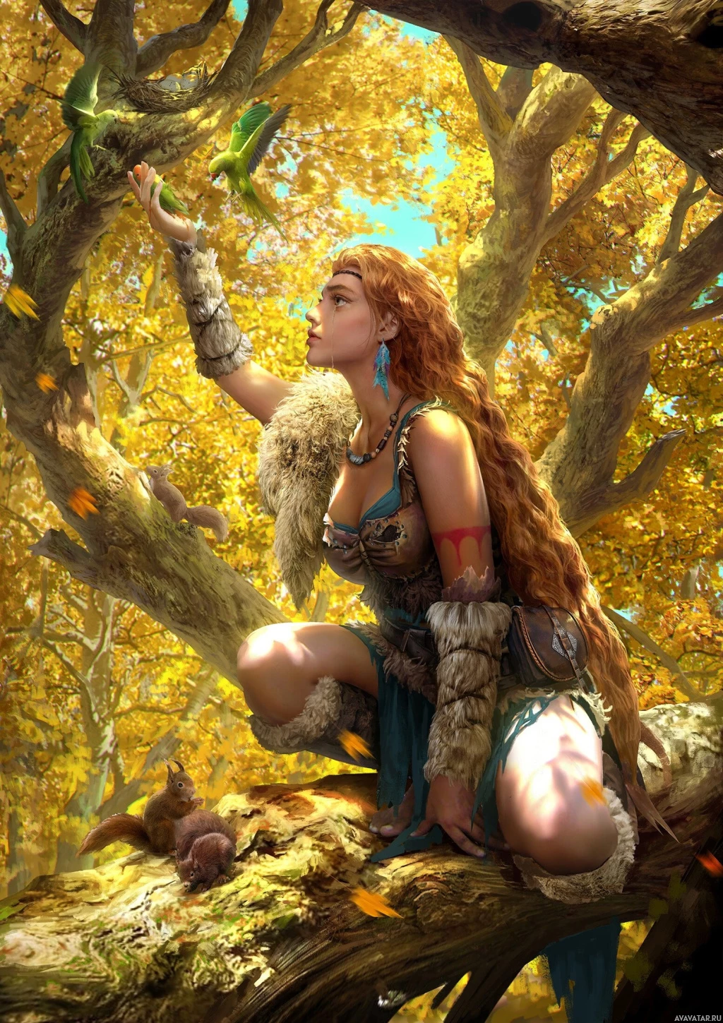 a tree branch. There are birds perched around her, suggesting that she may have tamed them or they are comfortable with her presence. The background shows lush green trees and foliage, indicating a peaceful,