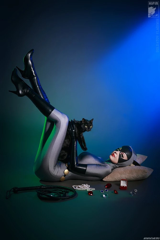 neutral color, providing a clear contrast to the main subject of the image. There are also various items scattered around, including what appear to be jewels or coins and what might be a whip or bullwhip, which could be related to Catwoman's character in comics and media.