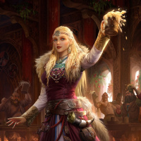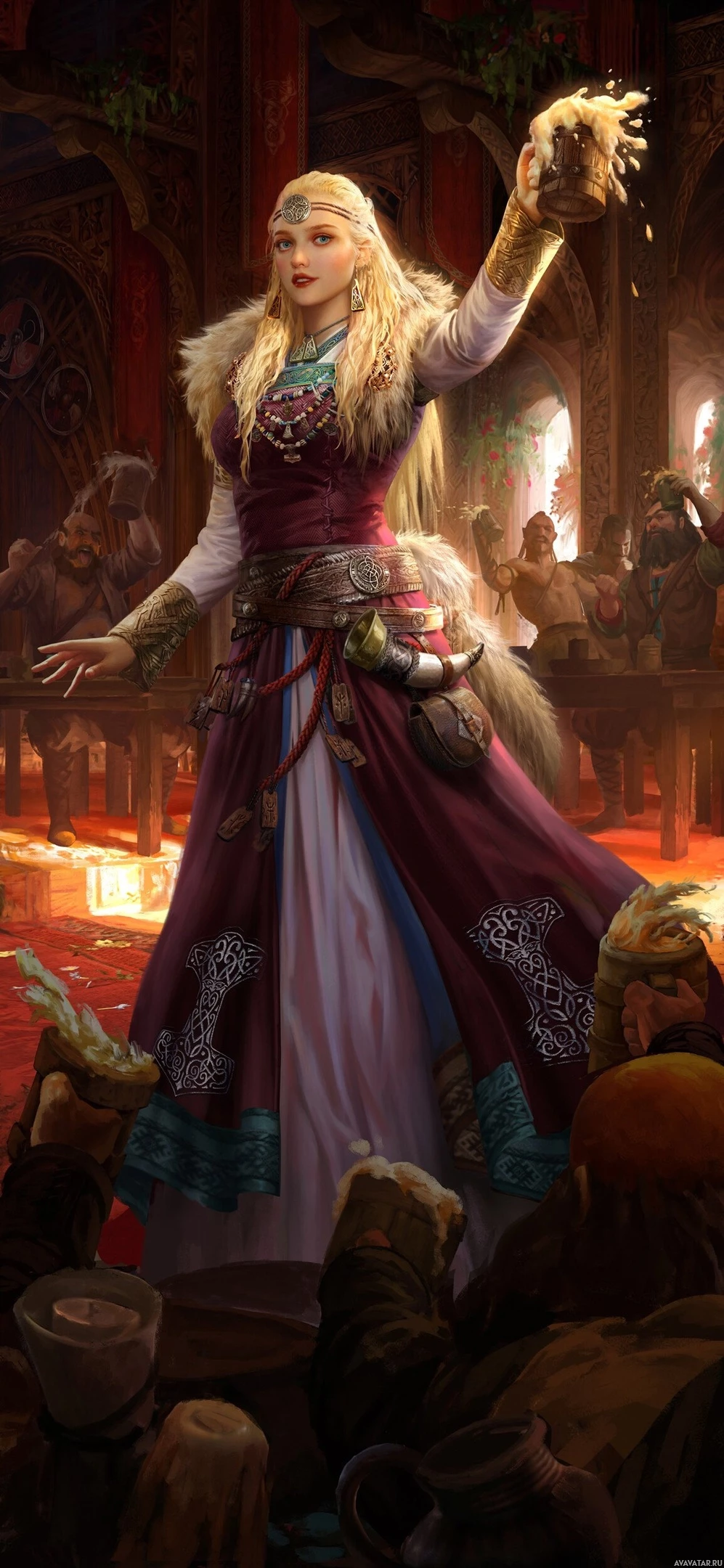 blonde hair and is wearing makeup, including lipstick and eyeshadow, which are typical for characters depicted in this style of artwork. The setting appears to be a festive gathering or a tavern, as there are other