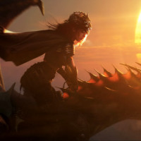 the warm lighting. In the background, there are silhouettes of flying creatures which could be more dragons or other