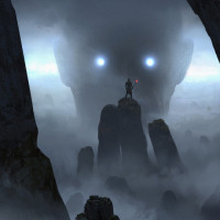 the center of the composition, there's a figure standing on what appears to be an island or rock formation surrounded by misty water. This character is holding out a hand in front of them, possibly as if they are reaching for something or contemplating their next move. To the left and right of this central figure, large stone structures tower above the landscape, with