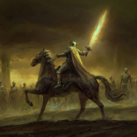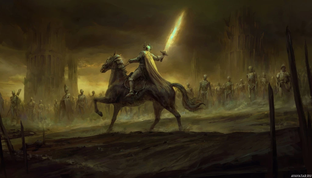 The image depicts a dark and ominous scene with a knight riding