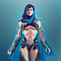 cybernetic enhancements, skilled combat abilities, and distinctive black hooded cloak with a white stripe on the left side of the face. This costume combines elements of cyberpunk or