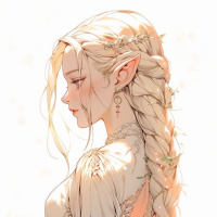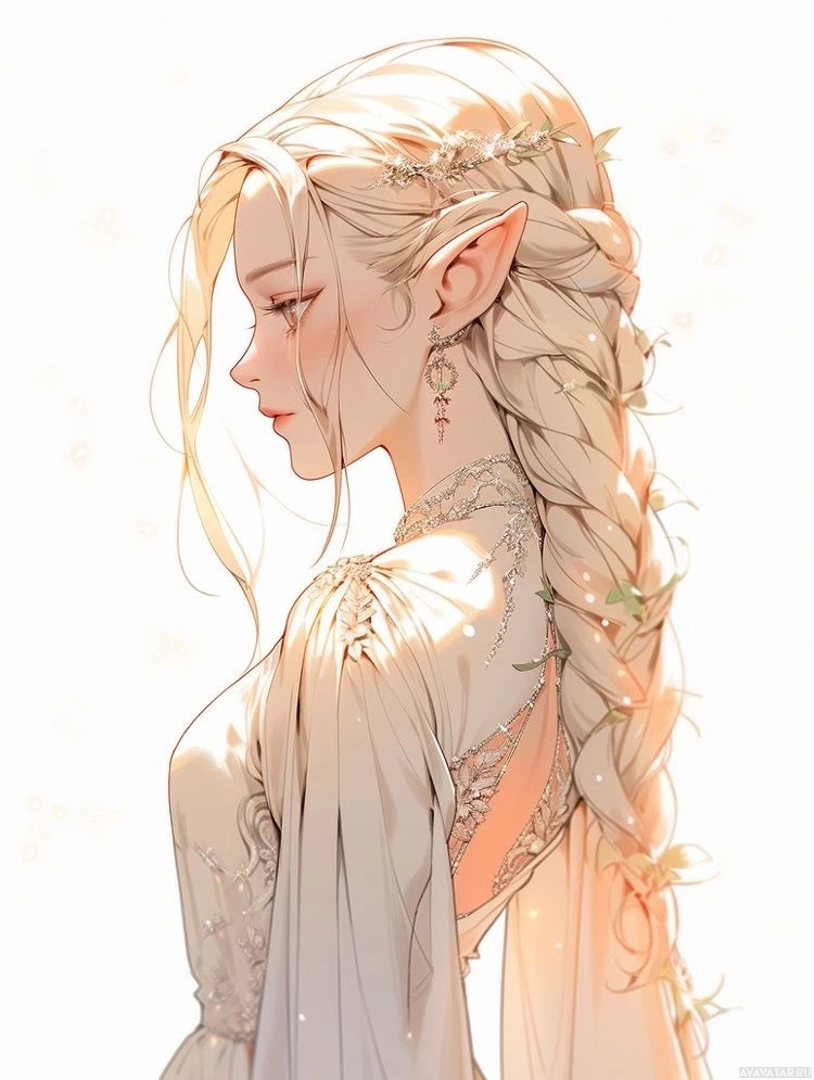 a female character with white hair styled in braids. She has pointed ears, indicative of her elf-like appearance, and is wearing what seems to be royal or fantasy clothing with