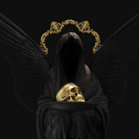 a dark background which enhances its ominous presence. There are also golden decorative elements surrounding the figure's head, adding to