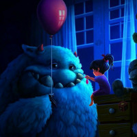 a pink balloon. Next to it, there is a child who appears to be interacting with the monster, possibly placing a ribbon on it or tying a bow around its neck. The room has various