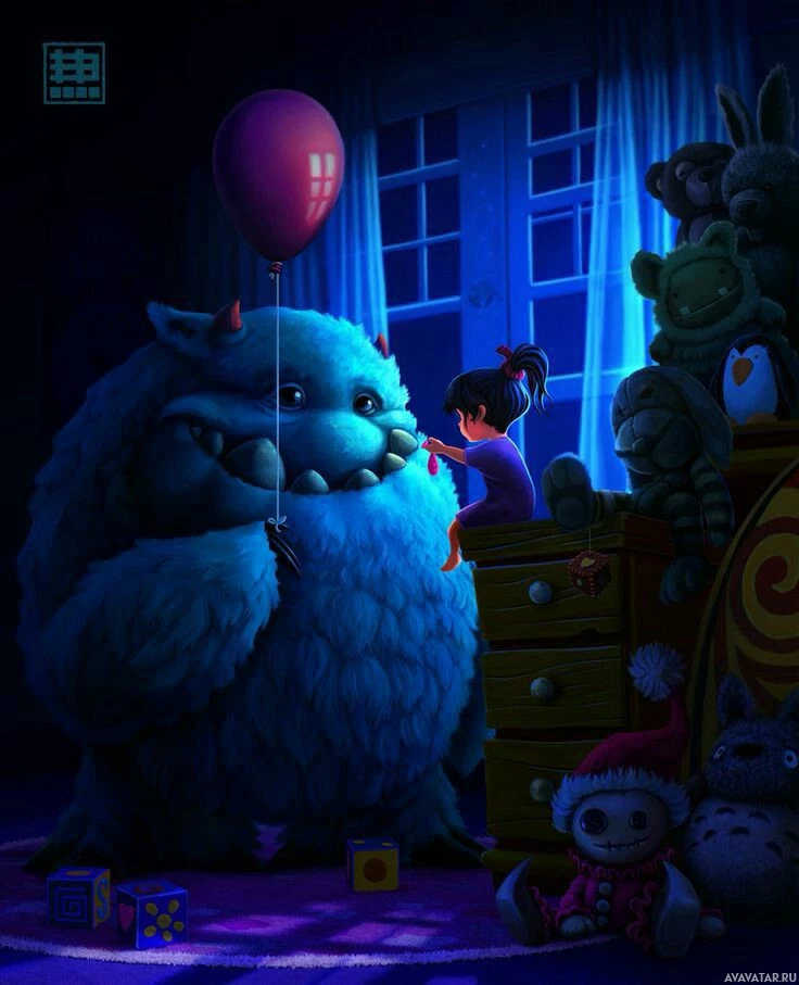 a nighttime scene in a child's bedroom. A monster is sitting on the floor, holding