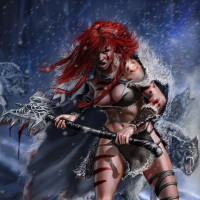 The image depicts a fantasy-themed illustration of a female character. She has red hair and is wielding an axe, suggesting she might be a warrior or a fighter in a story set in a fantasy world. The background features snowy mountainous terrain, which adds to the adventurous or battle-ready theme of the image.