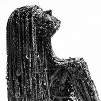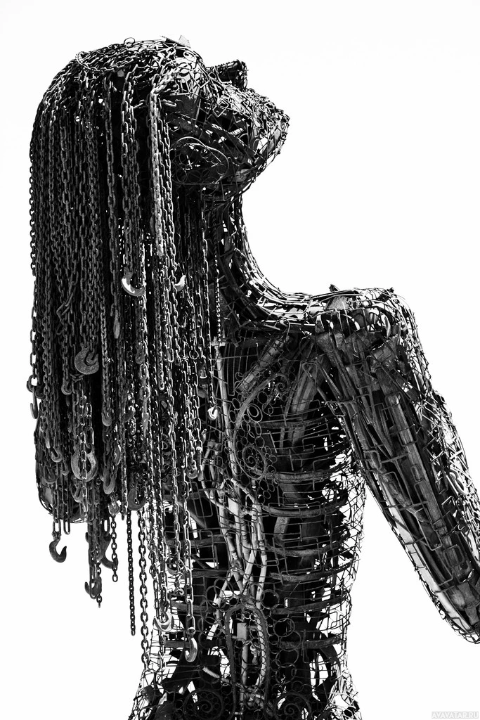 This image depicts a sculpture or artwork of a person, which appears to be composed of various mechanical and electronic parts. The figure has chains for hair and seems to have