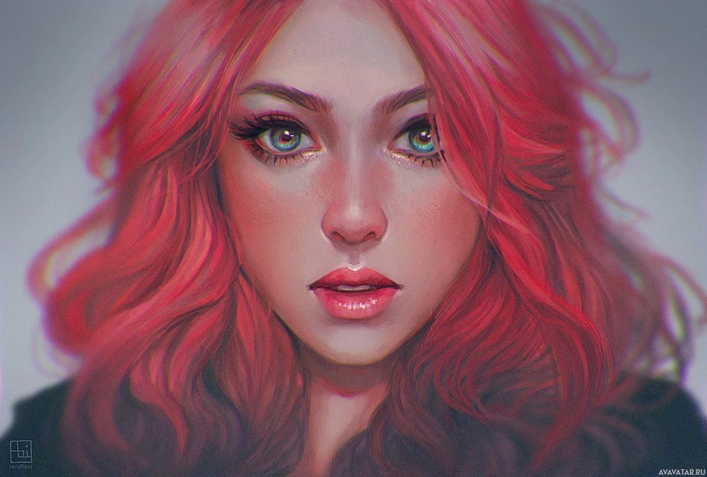 red eyes and is wearing lipstick, which complements her vibrant hair color. Her