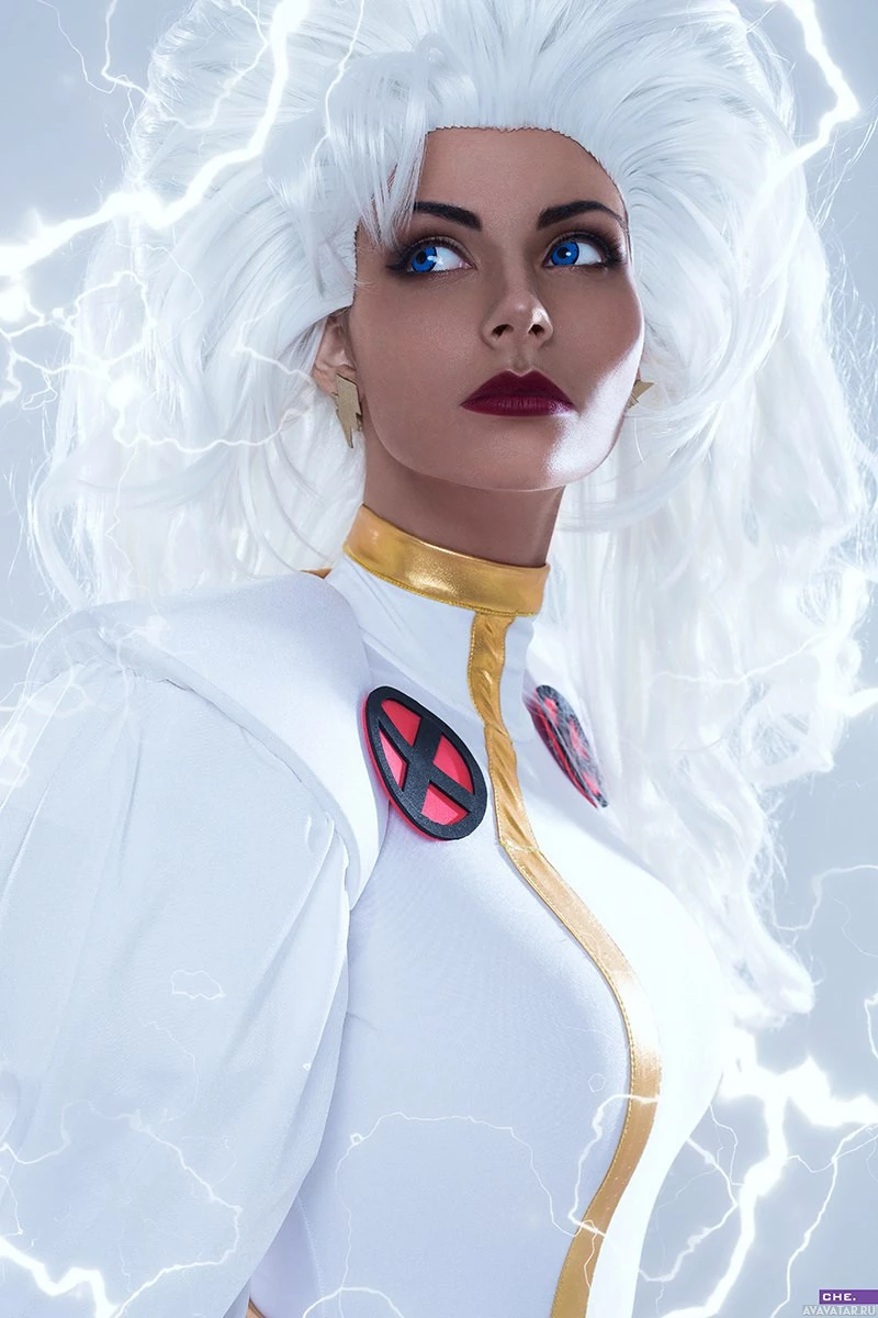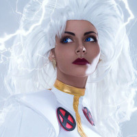 На картинке изображена женщина, одетая как Шторм из комиксов о Людях Икс. Она имеет белые волосы и носит белый и золотой костюм с символом молнии на груди, что характерно для костюма персонажа. Фон, кажется, размыт с тем, что кажется электричеством или энергией, подчеркивая тему супергероя, связанную с силами Шторма в серии Людей Икс.