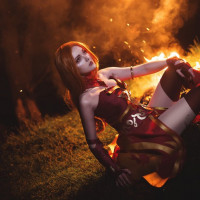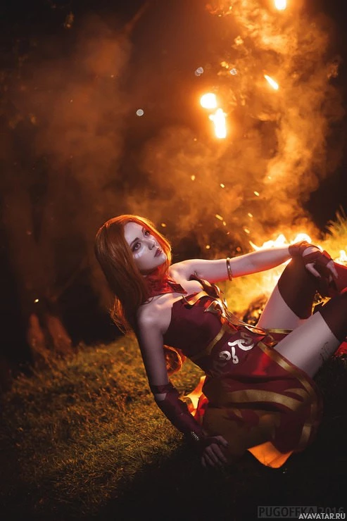 the video game Dota 2. The individual is posed with an intense expression and is surrounded by flames, which adds