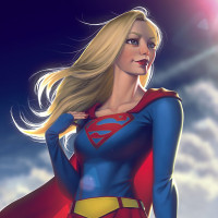 Supergirl costume, which includes a blue and red outfit with the "S" emblem prominently displayed on her chest, a cape, and a pair of boots. Her hair is styled in