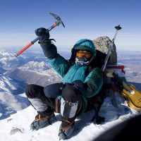 ski poles and appear to be wearing climbing gear, including crampons. There is snow visible around them, suggesting that they have reached the peak of the mountain during winter or