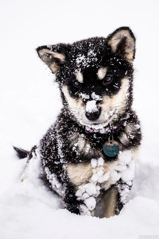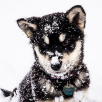 a snowy environment, possibly after a recent snowfall or in an area where there is ongoing snowfall. The puppy has some snow around its face, suggesting that it was engaged in playing in the snow.