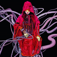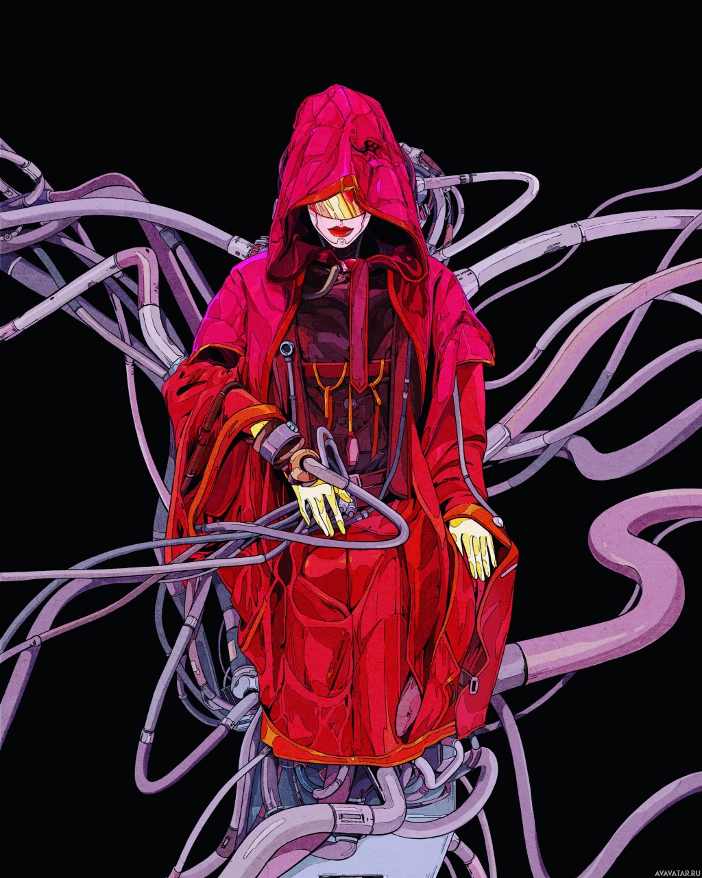 a red cloak with a hood, sitting amidst a complex network of wires and mechanical parts. The character appears to be engaged with or interacting with the machinery around them. The setting is dark, with a contrast between the brightness of the subject and the surroundings, which gives it an intense, perhaps