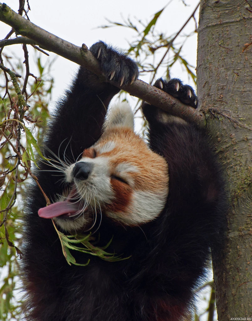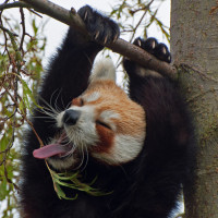 На картинке красная панда цепляется за ветви дерева. Это небольшое, древесное млекопитающее известно своей отличительной маркировкой лица и густыми хвостами. Красная панда, по-видимому, занимается какой-то деятельностью, которая может включать в себя поедание или взаимодействие с деревом или листьями.