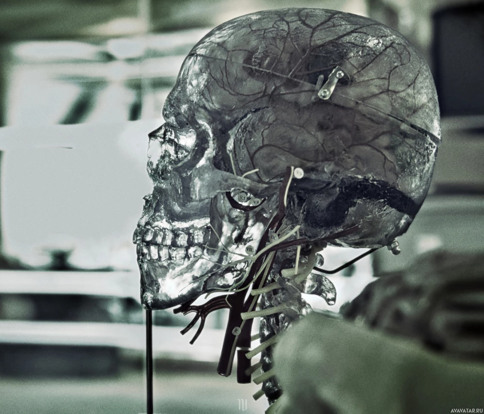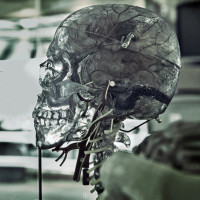 internal structures visible, such as the brain and vascular system, which are typically found in anatomical models or medical illustrations. The background appears to be a medical or educational setting, possibly a classroom or