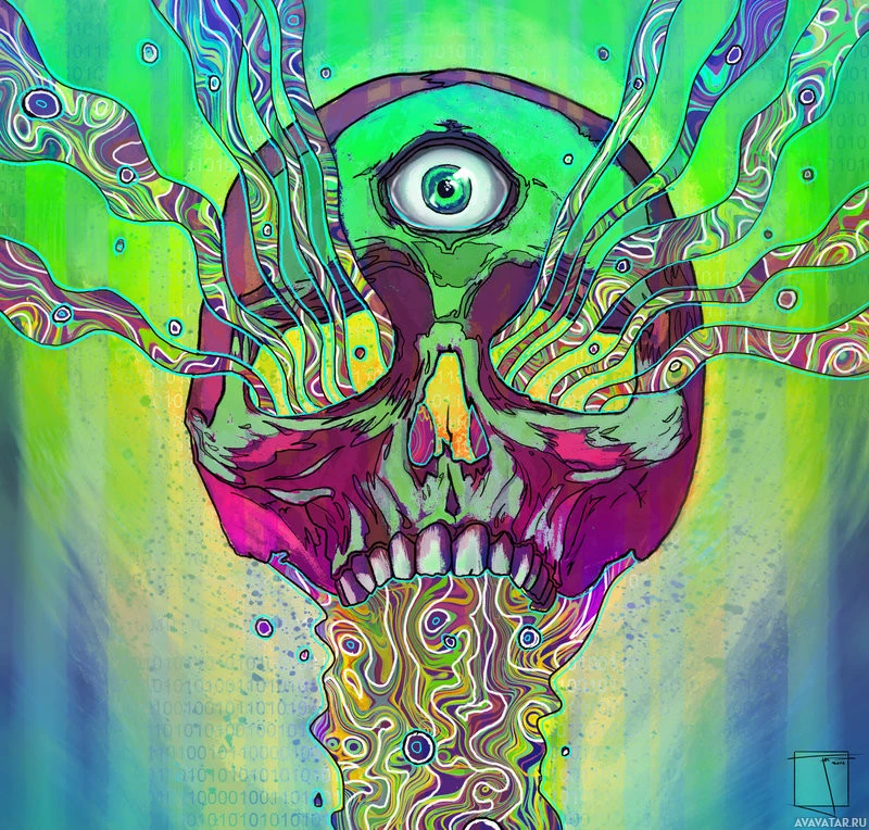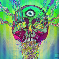an eye symbol in the center where the eyes would typically be located. The background has a psychedelic, swirling pattern with