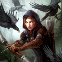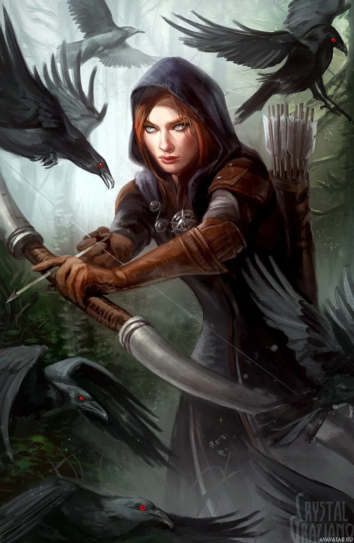 black birds that appear to be crows or ravens. There are also two arrows visible near the character's hand, suggesting she might be an archer or hunter. The setting appears to be a forest or wilderness with fog, contributing to a mysterious and somewhat ominous atmosphere.