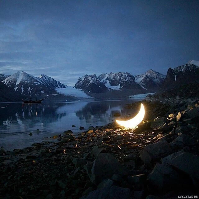 night scene at the coast. There is a crescent moon setting on the horizon, casting its light onto